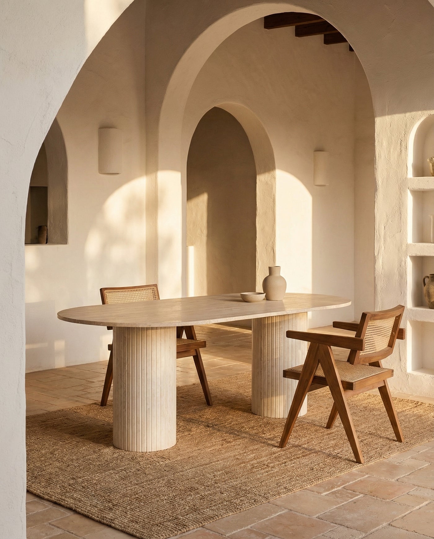 Avec son plateau en travertin blanc aux nuances subtiles et son piètement monolithique, la table Zinaya impose sa présence avec une allure majestueuse et minimaliste. Ses lignes épurées et équilibrées en font une pièce centrale idéale pour une salle à manger moderne, contemporaine ou wabi-sabi.