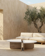 Avec son plateau circulaire épais et son piètement massif , la table Sanaa joue sur les volumes pour créer un équilibre parfait entre robustesse et légèreté . Son travertin aux teintes beiges et veinées capte magnifiquement la lumière, offrant un rendu minéral et apaisant .