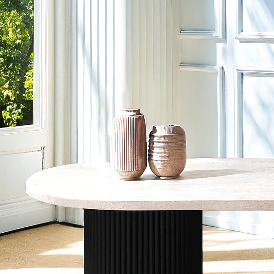 Lamia séduit par sa structure en bois massif, dont le veinage naturel contraste délicatement avec son plateau en travertin, aux nuances beige et veinées uniques. Son piètement robuste et structuré assure une excellente stabilité tout en conservant une esthétique fluide et légère.